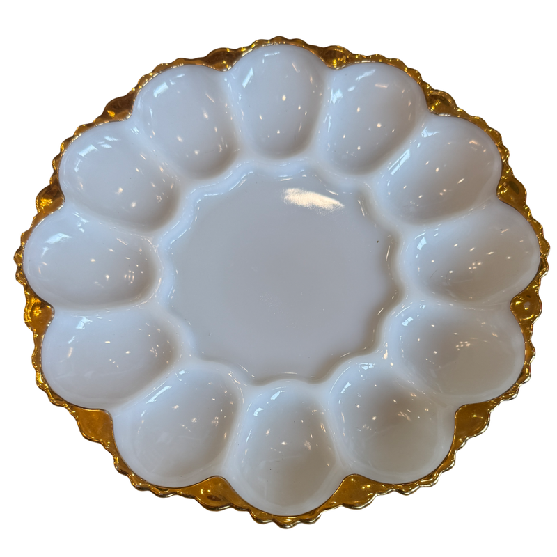 Vintage Milk Glass Deviled Egg Platter with Gold Rim