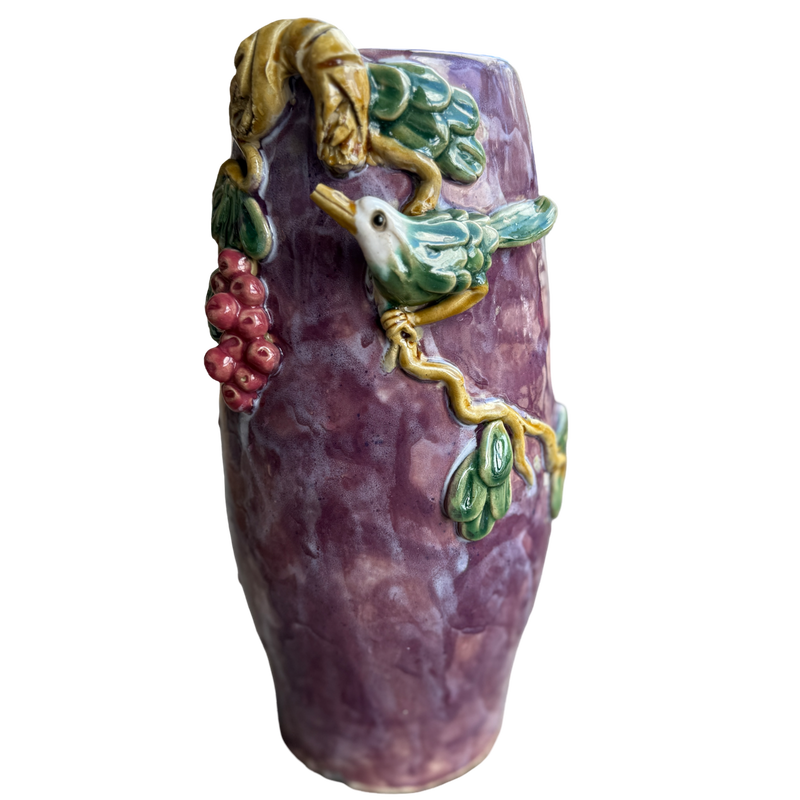 Vintage Majolica Style Bird and Grape Art Pottery Vase